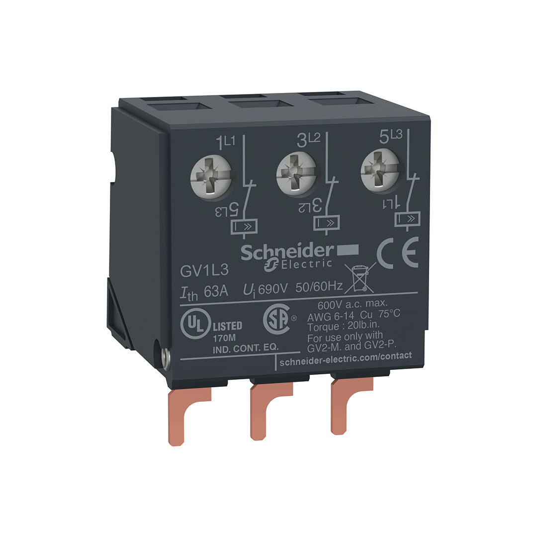 Ürün ÖzellikleriTeSys GV2, GV2P, GV2RT, GV2ME serisi motor devre kesicileri (motor circuit breakers, manual starters) ile uyumlu sınırlayıcı blok (current limiter module) Nominal akım: 63 A Çalışma gerilimi (rated operational voltage, Ue): ≤ 690 V AC Tetikleme akımı (activation threshold): 1,5 kA Kısa devre dayanımı (short-circuit capability): 100-130 kA @ 400 V AC (dependant on bağlı koruyucu cihaz) Montaj: GV2 serisi cihazların üstüne monte edilecek şekilde tasarlanmış (“on device mounting”) Bağlantı tipi: Vidalı kelepçe terminalleri (“screw clamp connections”)