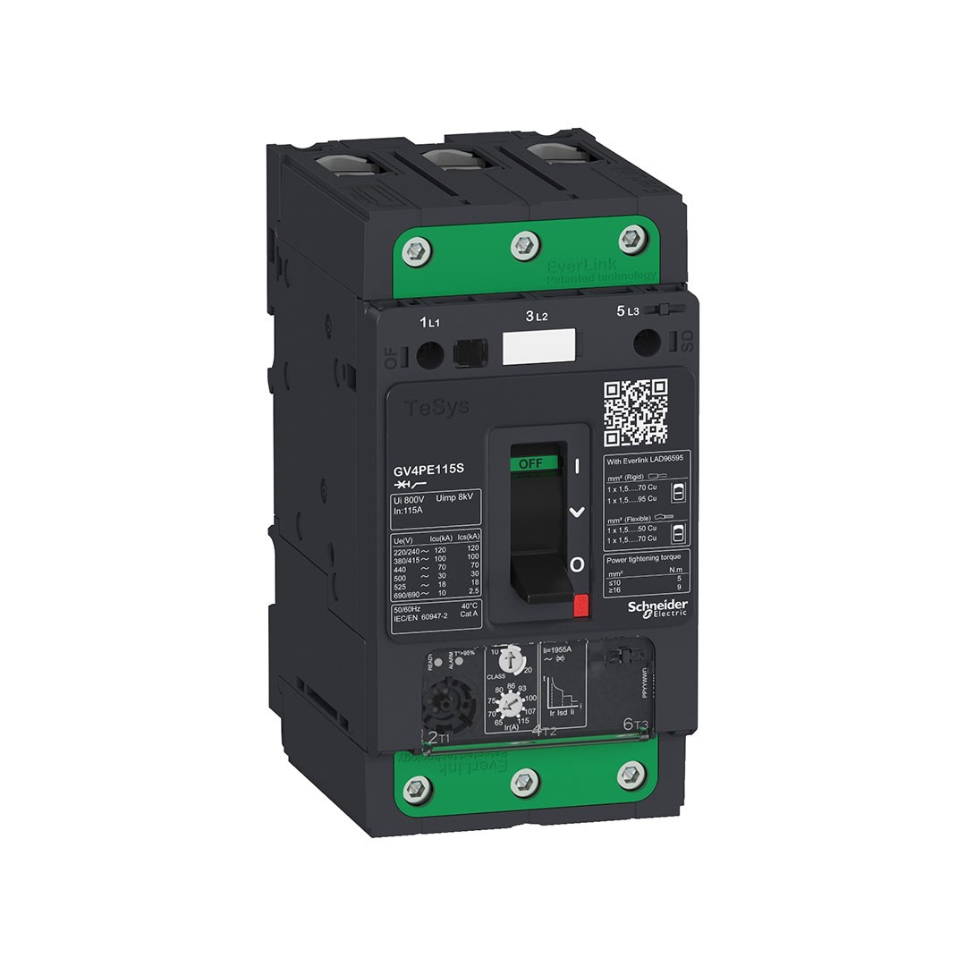 Range of productTeSys GV4RangeTeSys DecaDevice short nameGV4PEProduct nameTeSys GV4Product or component typeMotor circuit breakerDevice applicationMotor protectionTrip unit technology Thermal-magneticElectronicPoles description3PUtilisation categoryCategory A conforming to IEC 60947-2AC-3 conforming to IEC 60947-4-1Operating positionAny positionMotor power kW37 kW at 400…415 V AC 50/60 Hz45 kW at 500 V AC 50/60 Hz22 kW at 400…415 V AC 50/60 Hz30 kW at 500 V AC 50/60 Hz37 kW at 660…690 V AC 50/60 Hz45 kW at 660…690 V AC 50/60 Hz55 kW at 660…690 V AC 50/60 Hz30 kW at 400…415 V AC 50/60 Hz37 kW at 500 V AC 50/60 HzBreaking capacity120 kA Icu at 220…240 V AC 50/60 Hz conforming to IEC 60947-2100 kA Icu at 380…415 V AC 50/60 Hz conforming to IEC 60947-270 kA Icu at 440 V AC 50/60 Hz conforming to IEC 60947-230 kA Icu at 500 V AC 50/60 Hz conforming to IEC 60947-218 kA Icu at 525 V AC 50/60 Hz conforming to IEC 60947-2100 kA at 208Y/120 V AC 50/60 Hz conforming to UL 60947100 kA at 240 V AC 50/60 Hz conforming to UL 6094765 kA at 480Y/277 V AC 50/60 Hz conforming to UL 6094710 kA Icu at 660…690 V AC 50/60 Hz conforming to IEC 60947-225 kA at 600Y/347 V AC 50/60 Hz conforming to UL 60947Control typeToggle[In] rated current80 AMagnetic tripping current1360 A[Ue] rated operational voltage690 V AC 50/60 Hz conforming to IEC 60947-2[Ui] rated insulation voltage800 V AC 50/60 Hz conforming to IEC 60947-2[Ith] conventional free air thermal current115 A conforming to IEC 60947-4-1[Uimp] rated impulse withstand voltage 8 kV conforming to IEC 60947-2Power dissipation per pole4.6 WMechanical durability40000 cyclesElectrical durability14000 cycles for AC-3 at 440 V In/27000 cycles for AC-3 at 440 V InMaximum operating rate25 cyc/hRated dutyContinuous conforming to IEC 60947-4-1Connections – terminalsEverLink BTR screw connectors (top) 1 cable(s) 1.5…70 mm² – solidEverLink BTR screw connectors (top) 1 cable(s) 1.5…50 mm² – flexibleEverLink BTR screw connectors (bottom) 1 cable(s) 2.5…95 mm² – solidEverLink BTR screw connectors (bottom) 1 cable(s) 2.5…70 mm² – flexibleTightening torque9 N.m for cable 16…95 mm²5 N.m for cable 1.5…10 mm²Mechanical robustnessVibrations: +/- 1 mm 2…13.2 Hz conforming to IEC 60068-2-6Vibrations: 0.7 gn 13.2…100 Hz conforming to IEC 60068-2-6Shocks: 15 gn 11 ms conforming to IEC 60068-2-27Phase failure sensitivityYes conforming to IEC 60947-4-1Height155 mmWidth81 mmDepth116 mmNet weight1.45 kgColourGrey (RAL 7016)Suitability for isolationYes conforming to IEC 60947-1
