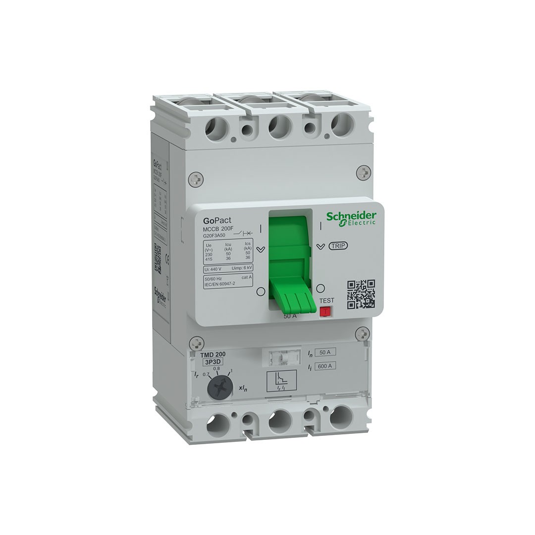 Teknik ÖzelliklerSeri: GoPact MCCB 200Model: G20F3A50 (3P / 3D, 50 A sabit termal-manyetik trip ünitesi, ayarlanabilir termal koruma) Nominal Akım (In): 50 A @ 40 °C; termal ayar aralığı: 0.7…1 × In (≈ 35–50 A), manyetik kesme ≈12 × In (≈600 A) Koparma Kapasitesi (Icu): 36 kA @ 380/415 V AC; servis kesme kapasitesi (Ics) ≈36 kA; 50 kA @ 220/230 V AC kullanımına uygundur Nominal Gerilim (Ue): 415 V AC, 50/60 Hz; Yalıtım Gerilimi (Ui): 440 V AC; Darbe Dayanımı (Uimp): 6 kV Dayanıklılık: Mekanik ≥ 30 000 döngü; Elektriksel ≥ 8 000 döngü @ In Fiziksel Özellikler: Genişlik ≈ 75 mm × Yükseklik ≈ 130 mm × Derinlik ≈ 60 mm; ağırlık ≈ 0.9 kg; renk: gri (RAL 7035) Montaj & Bağlantı: Sabit panel tipi; vida terminallerle ön bağlantı; 25 mm bağlantı aralığı; yatay/dikey montaja uygun Standartlar & Sertifikalar: IEC/EN 60947‑1 ve IEC/EN 60947‑2 uygun; Utilization Category A; IP20 koruma sınıfı; IEC pollution degree 3; overvoltage category III